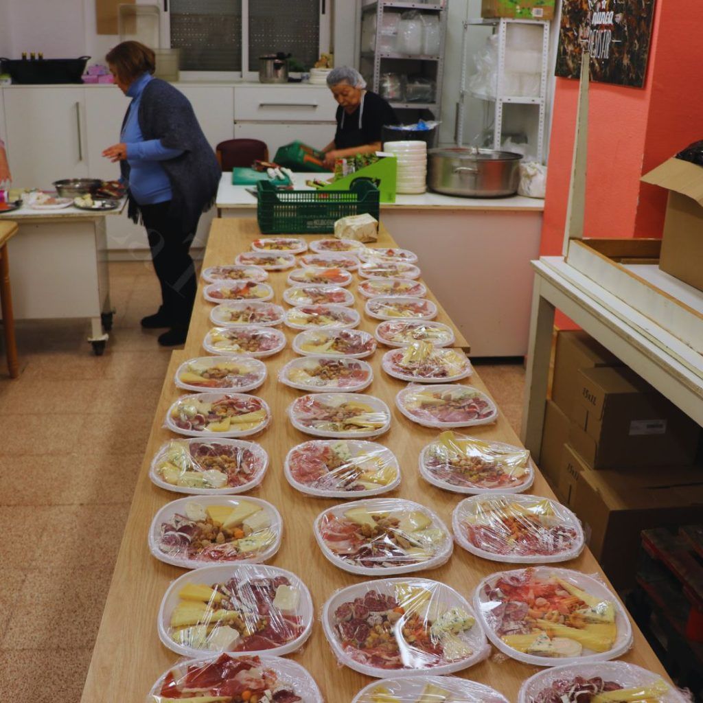 Debido a que el local no permite que los 85 usuarios diarios coman dentro (lo que requeriría dos o tres turnos, haciendo que el último fuese una merienda), la comida se entrega para llevar en recipientes tipo tupper. Se ofrecen menús variados, desde lentejas y potaje hasta paellas, pescado en salsa y guisos. Siempre con la intención de que sean recetas nutritivas, que garanticen sustento vitamínico a las familias, en especial a los más peques de la casa.